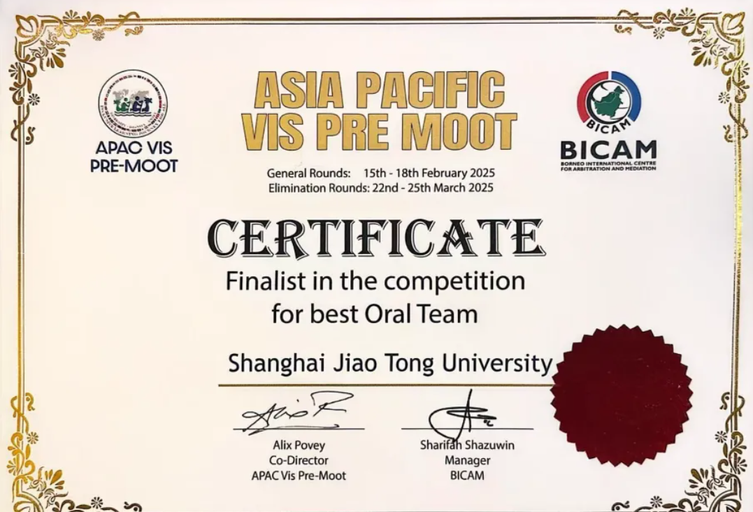 From February 15th to 18th, 2025, in the online round-robin competition of the Asia-Pacific International Commercial Arbitration Moot (APAC Moot), the team from the School of Foreign Languages of Shanghai Jiao Tong University stood out from over 150 top university teams from around the world, and advanced to the global finals with an outstanding total score of eighth place.