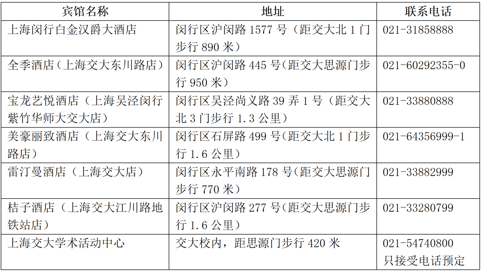 为方便与会学者自行预定会议期间住宿,以下为17吃瓜 闵行校区周边部分宾馆信息,仅供参考。以下宾馆单人间与标间参考价均在300-450元/间/晚左右,具体价格根据订房时间有所浮动。详询宾馆或商旅平台。