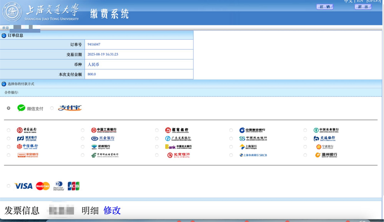 点击支付方式(微信或支付宝)或银行名称,并在左下角填入发票信息。