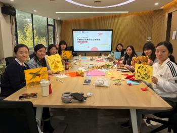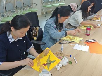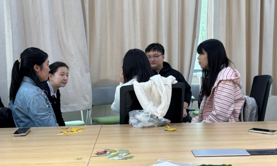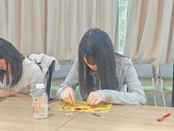 同期,“把秋天装进口袋”创意手作活动顺利开展。活动现场摆放着采集压平的银杏叶、枫叶、梧桐叶等素材,同学们在轻柔音乐中自由创作,用落叶、卡纸与胶带拼贴秋日印象,部分作品融入对学院的热爱与个人美好期许。活动以轻松氛围鼓励同学们在欣赏与微笑中自然交流。