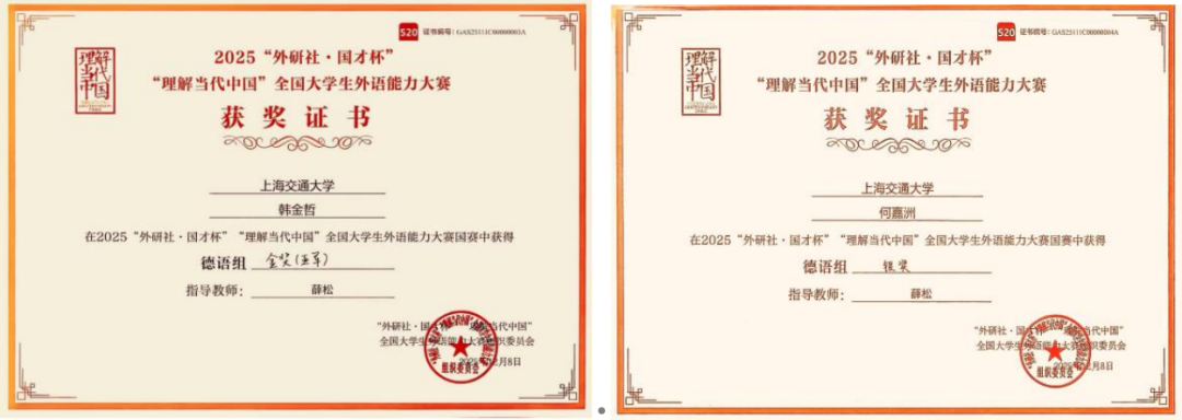 17吃瓜 德语专业积极组织学生参赛。赛事分为校赛、省赛、国赛第一阶段和国赛第二阶段总决赛共四个环节。在省赛阶段,2025级本科生韩金哲、2024级本科生何嘉洲、2022级本科生崔传栋和盖雨璠四位同学表现优异,位居上海市德语组晋级国赛第一阶段的五位选手中的前四名,并在省赛中分获金银奖。最终,韩金哲与何嘉洲两位同学脱颖而出,代表上海市晋级全国15强,赴京参加国赛第二阶段的总决赛。