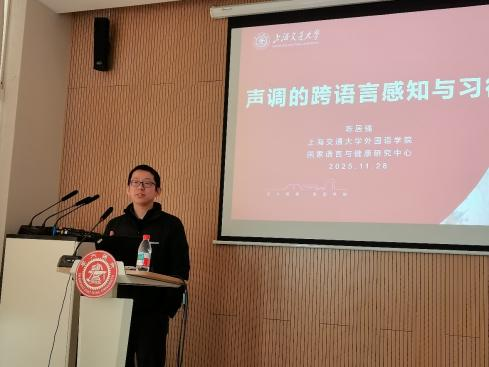 陈居强博士汇报了一系列基于感知同化模型设计的跨语言声调语音实验,研究探讨母语背景、记忆负荷、语音变异等因素对汉语和越南语母语者感知泰语声调的影响,为声调教学提供实证依据。